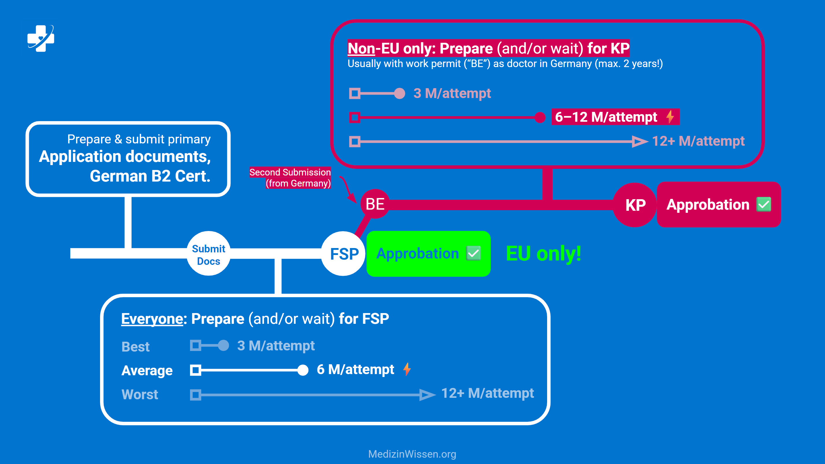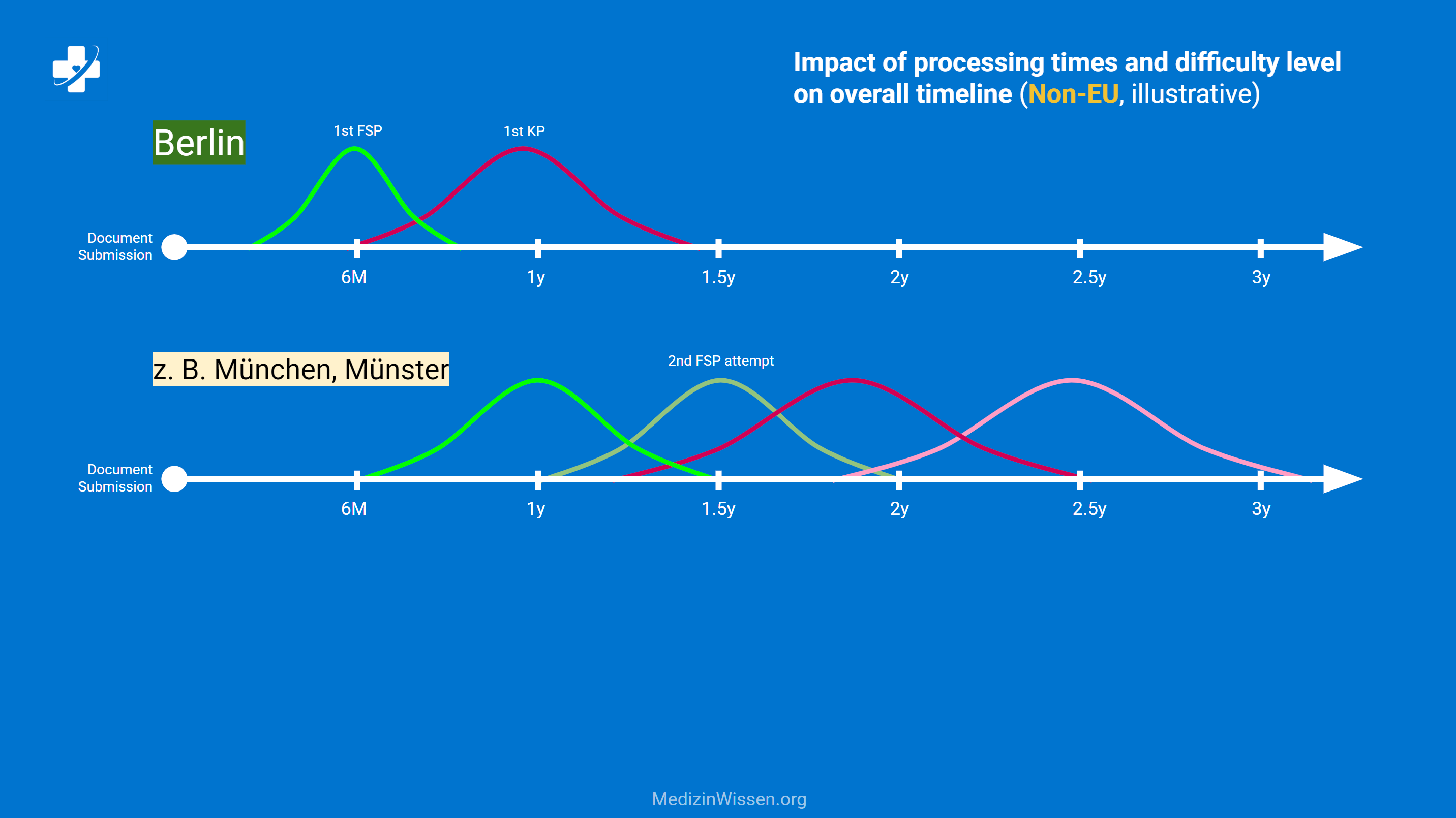 Dies hängt von verschiedenen Faktoren ab, maßgeblich davon, ob sie aus einem EU- oder Nicht-EU-Land kommen und natürlich auch von der ➡️ Wahl ihres Bundeslandes. Hier eine Illustration der typischen Wahrscheinlichkeiten für die Dauer ihres Verfahrens. Selbstverständlich verlängert auch jede durchgefallene Prüfung ihren Weg erheblich. Späterer Berufseinstieg bedeutet hier ggf. auch ein Verlust an Einkommen. Und selbst wenn sie während der Berufserlaubnis bereits ein Einkommen erzielen, so verzögert sich doch eher der Beginn ihrer Facharztweiterbildung.